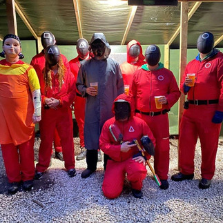 Tablers arrived, cursed the weather and practically swam out to the campsite. They scoffed down dinner and a drink before the Exec arrived - wearing masks, dressed in bright pink jumpsuits and carrying paintball guns. The Squid Game had begun!